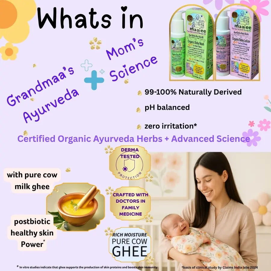 Ayurvedic & Organic baby products for sensitive skin are made from natural, herbal ingredients that nourish and protect the skin without the use of harmful chemicals. Maaiee has formulated Ayur-Ghrita Post-Biotic Organic Baby Lotion which is free from harmful chemical with all natural & organic certified ayurvedic herbs blended in pure organic cow milk ghee known as ghrita in ayurveda. These ayurvedic wisdoms are blended with principals of science like xylitylglucoside & Anhydroxylitol & xylitol,vitamin B5,olive squalane,allantoin,ZnO to achieve utmost soothing healing care and comfort for new borns delicate and sensitive skin. Regular lotions often contain synthetic fragrances, parabens, and other harmful additives that can irritate sensitive baby skin.