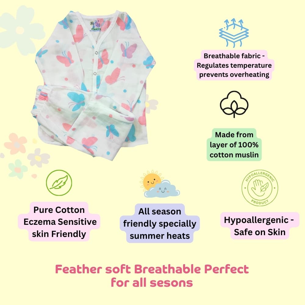 Give your newborn all-day comfort with Maaiee’s Pure Cotton Muslin Night Suit Set, designed specifically for sensitive skin