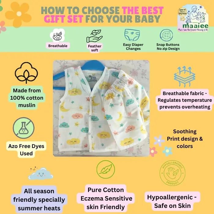 100% Pure Muslin Cotton – Soft, breathable, and hypoallergenic fabric ideal for newborns and sensitive skin.